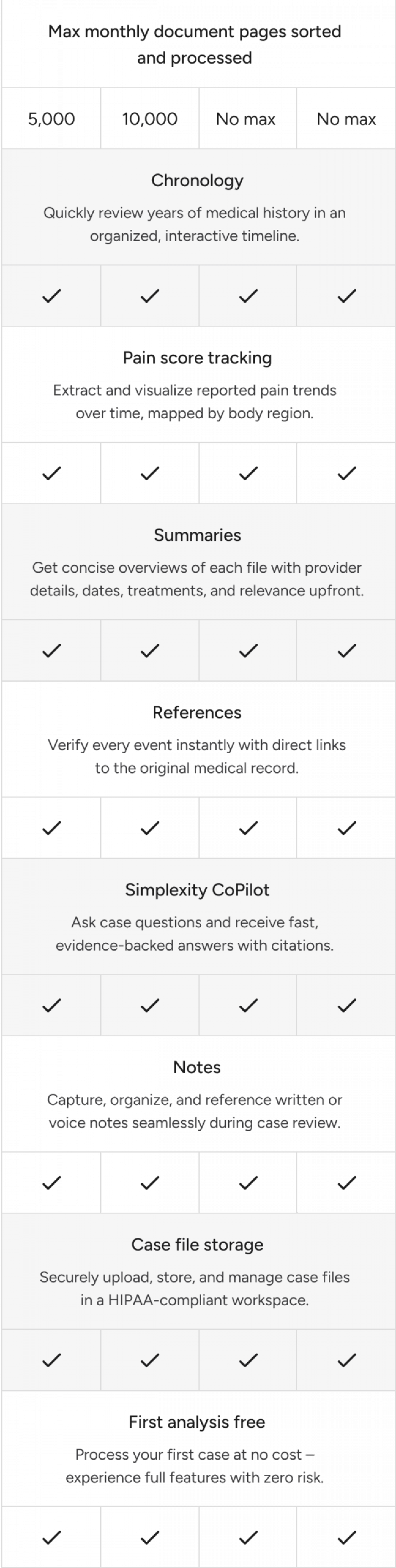 All plans are based on your document processing needs and include your first case analysis free, complete access to all features, HIPAA-compliant protection, and expert support whenever you need it.